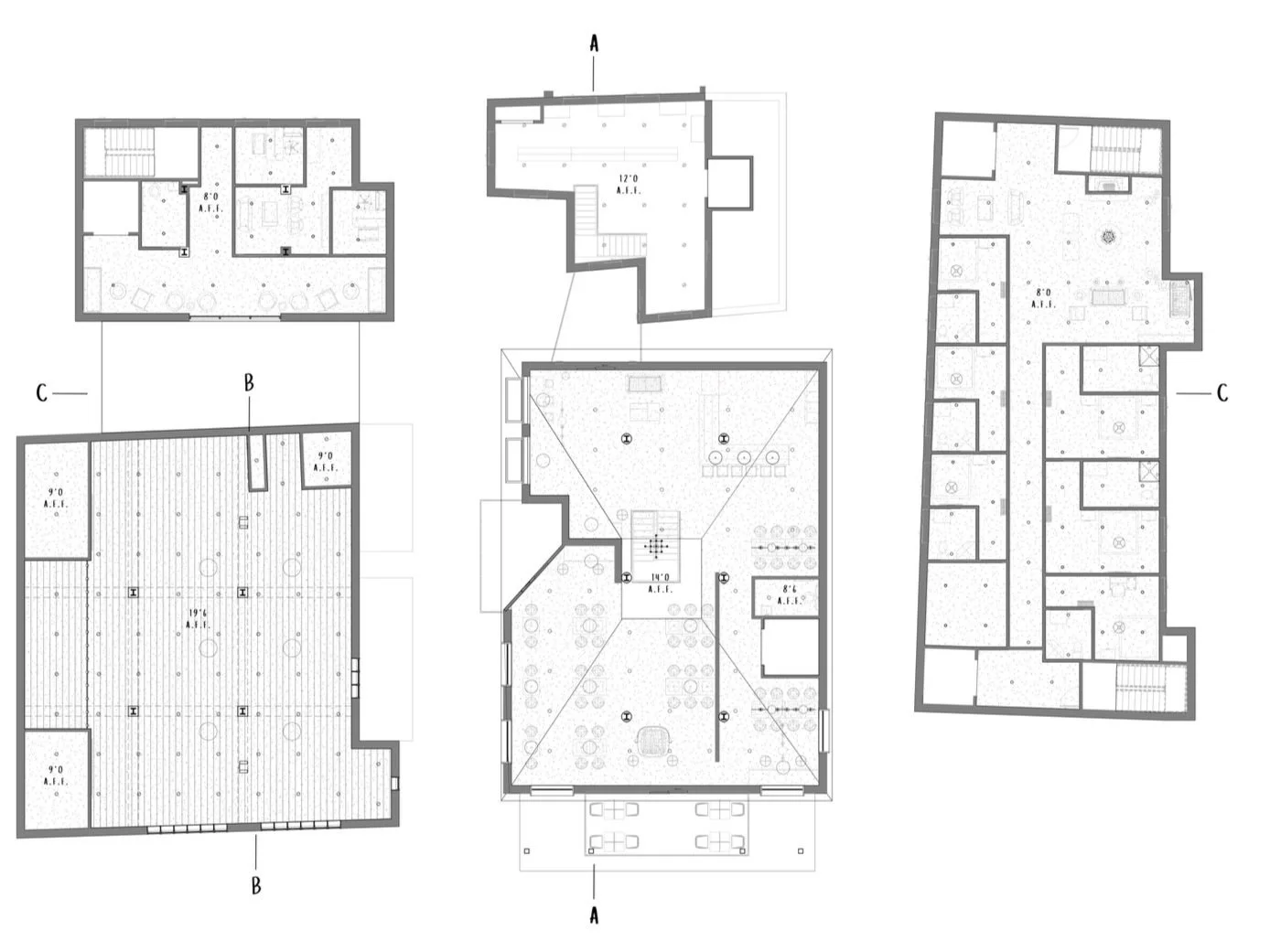 Custom bench is a repeating element throughout the space, providing varied seating and privacy for small groups.